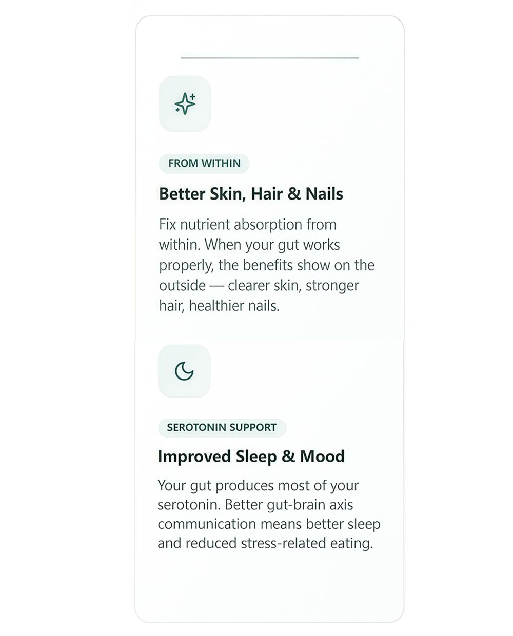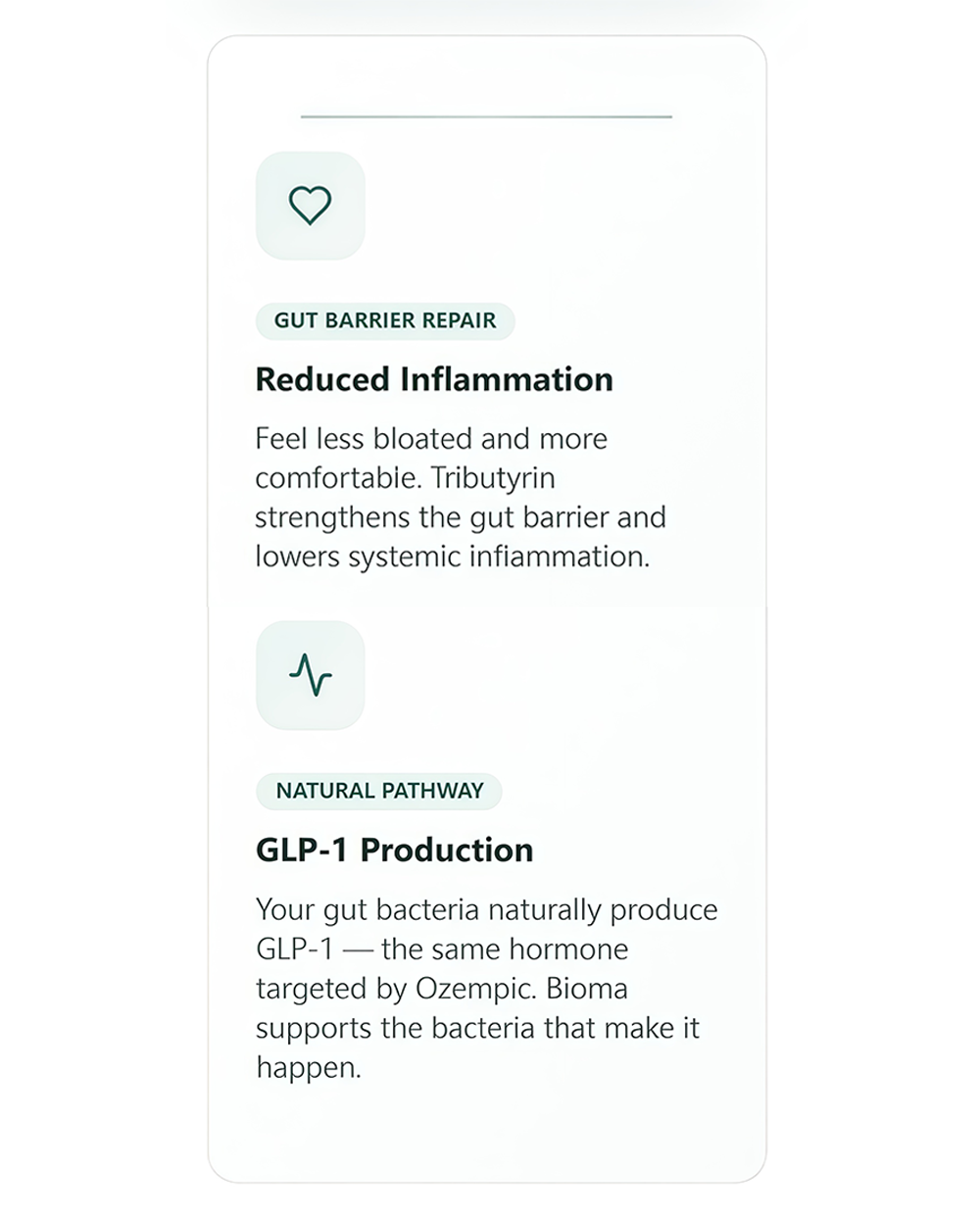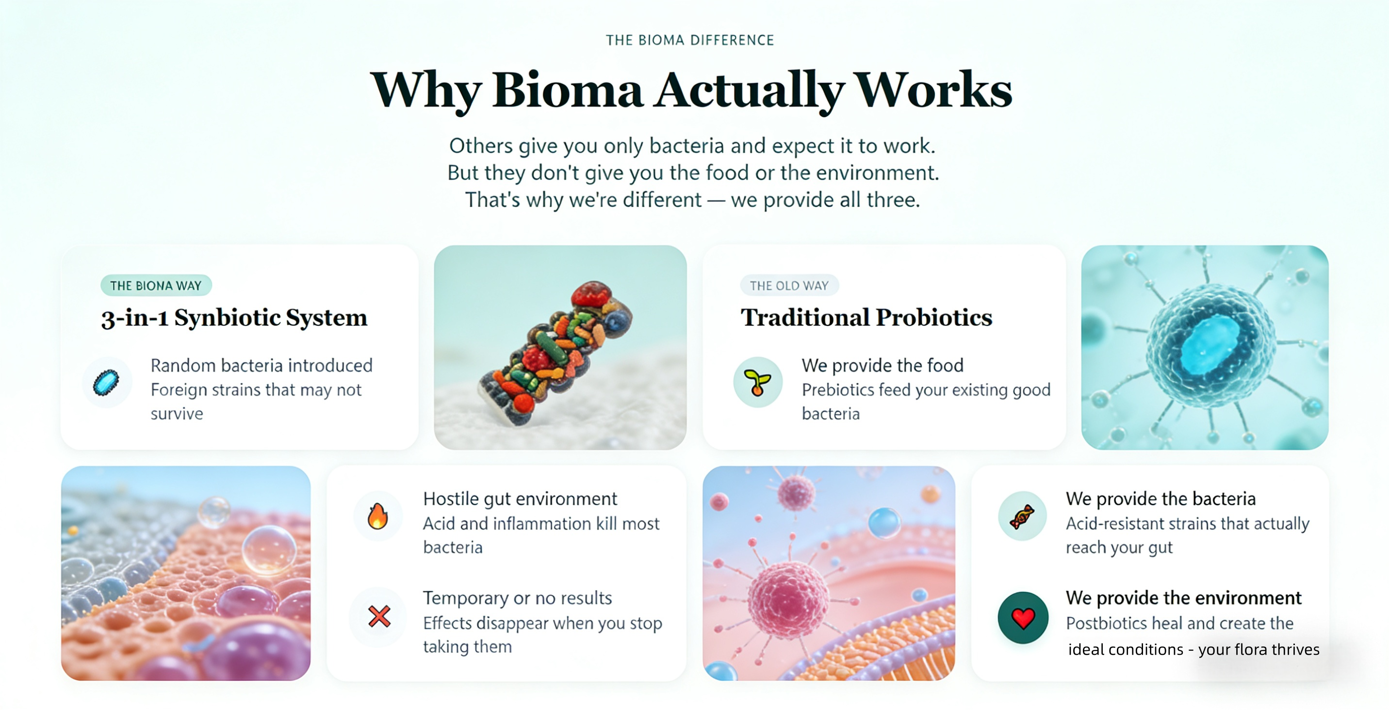 Unlike traditional probiotics that simply add foreign bacteria to your gut, Bioma uses a 3-in-1 synbiotic approach. We combine prebiotics (to create the right environment), probiotics (targeted beneficial strains), and postbiotics (to heal and strengthen the gut lining). This system works with your natural gut flora rather than trying to replace it, creating sustainable, long-term improvements.
