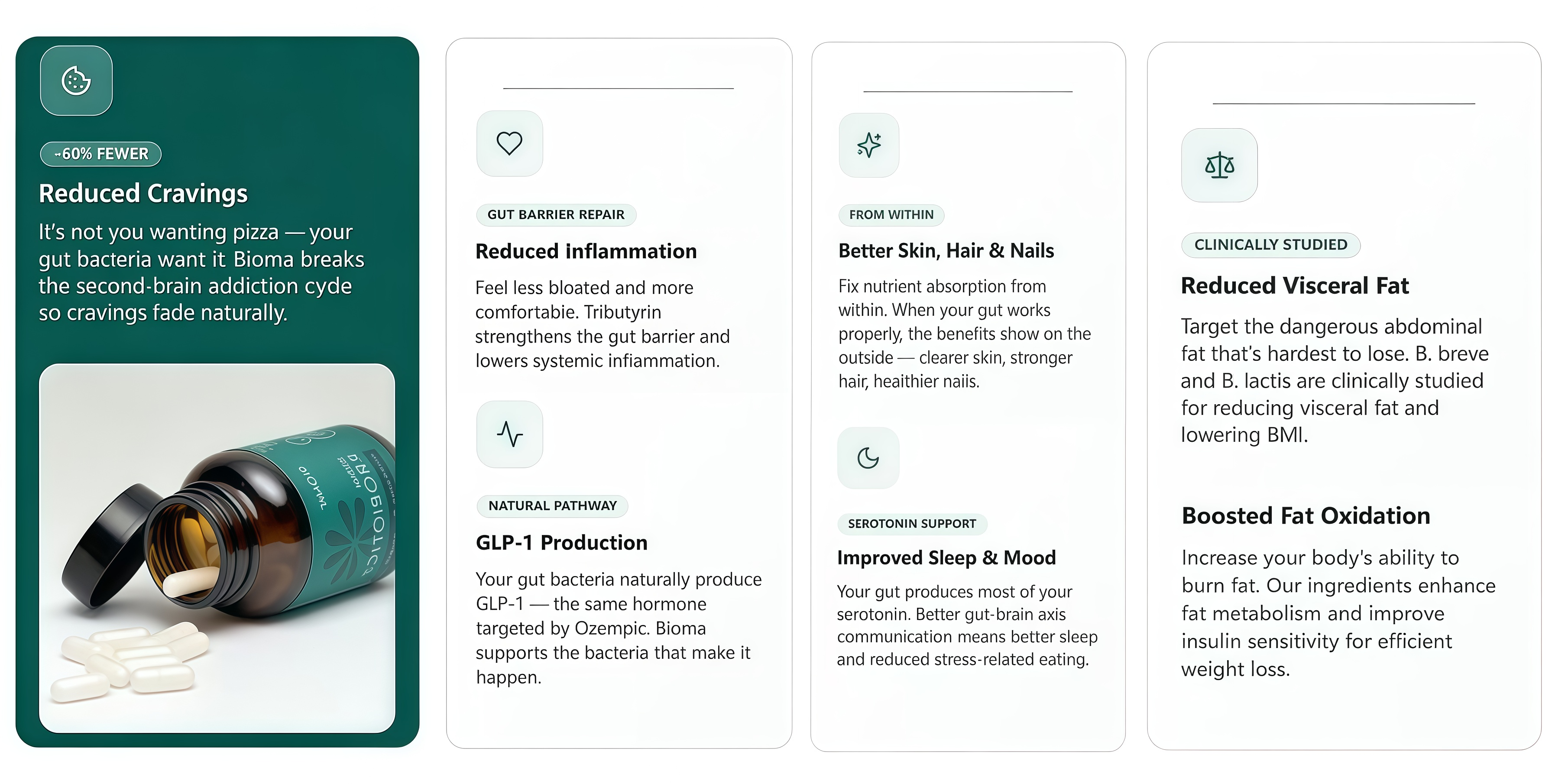 - Get to the root cause of weight bouncing back, hungerpangs, sugarcravings, and slow metabolism. Bioma's 3-in-1 synbiotic revives yourunique gut flora so your bodycan naturally regulate appetite, boost metabolism, and loseweight -for the last time.